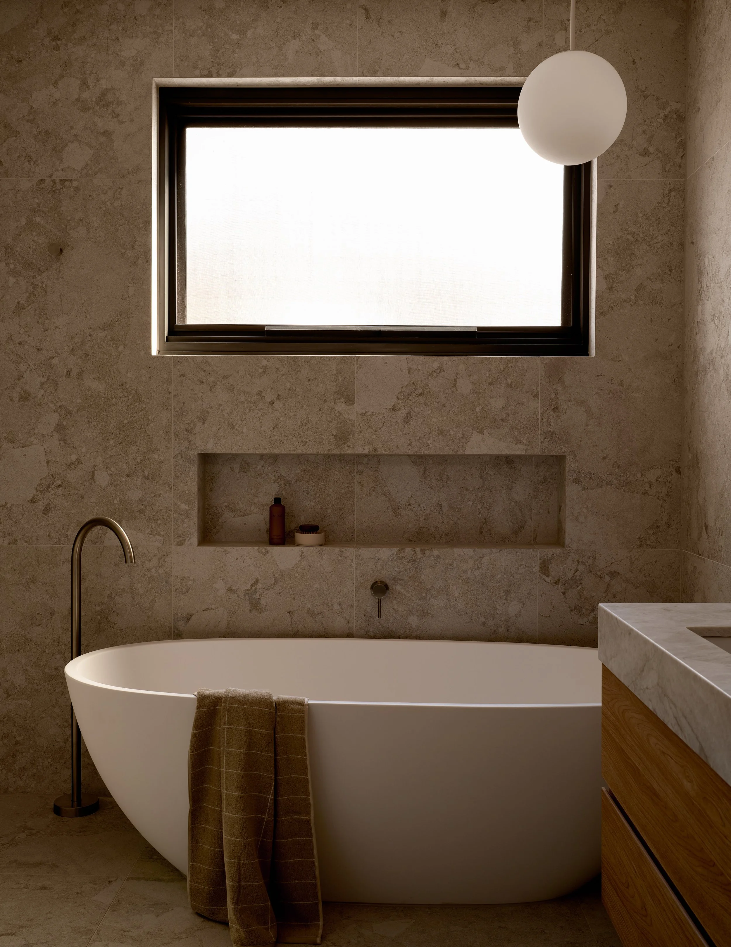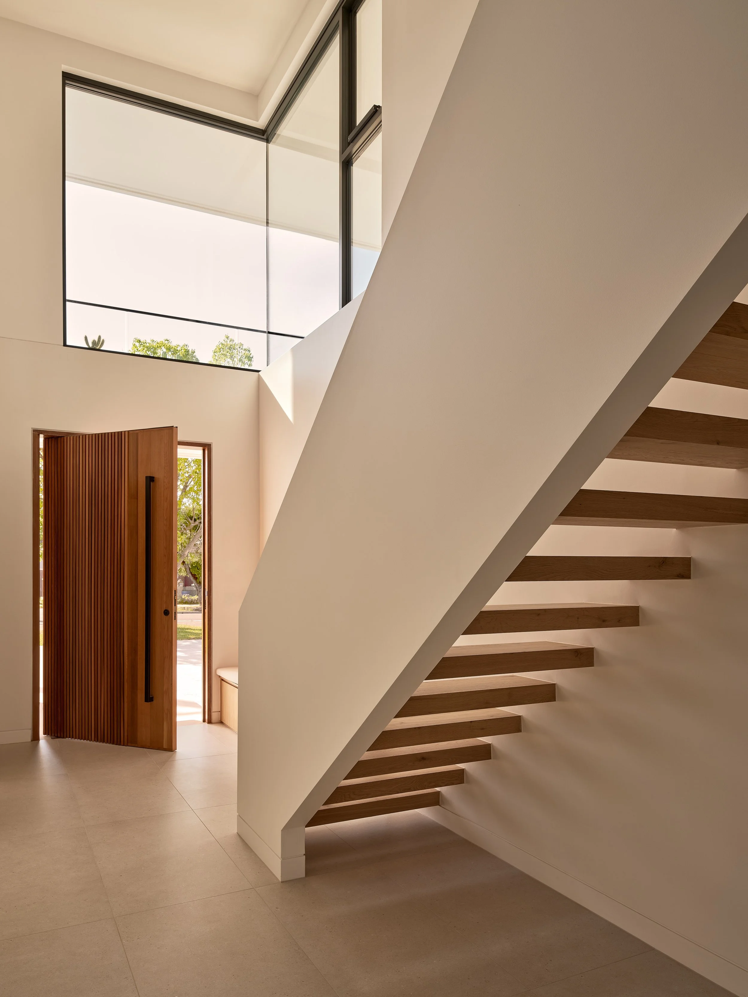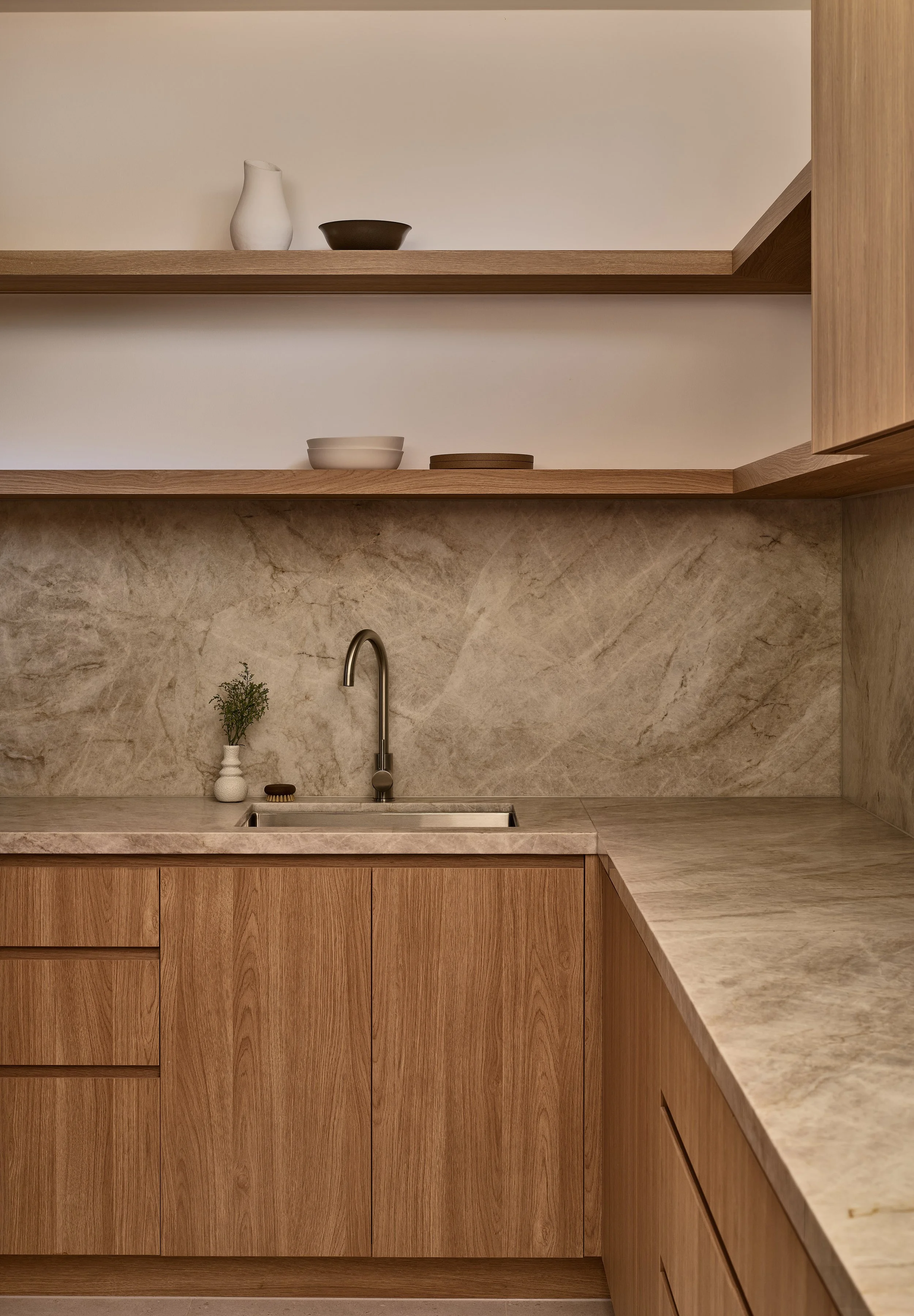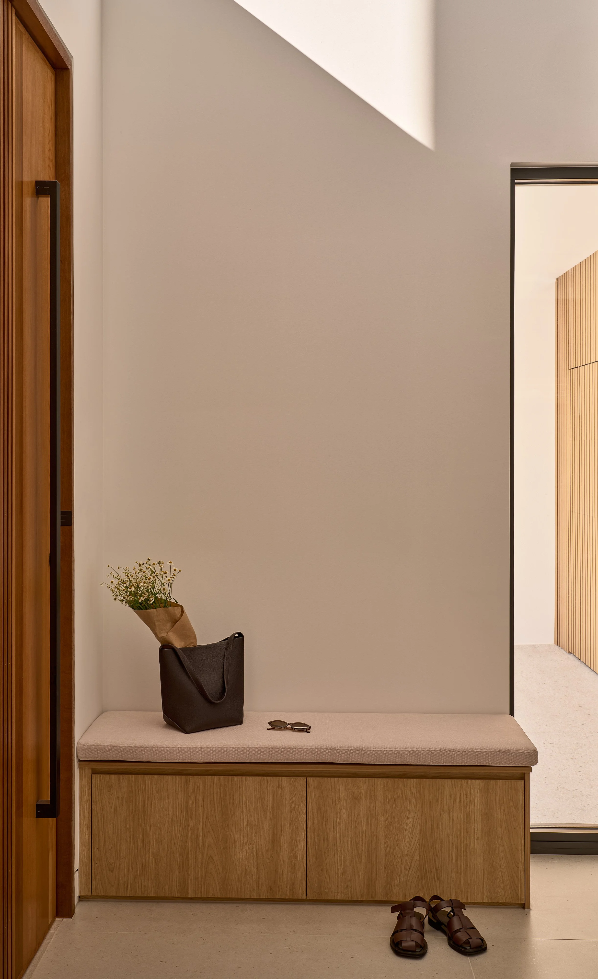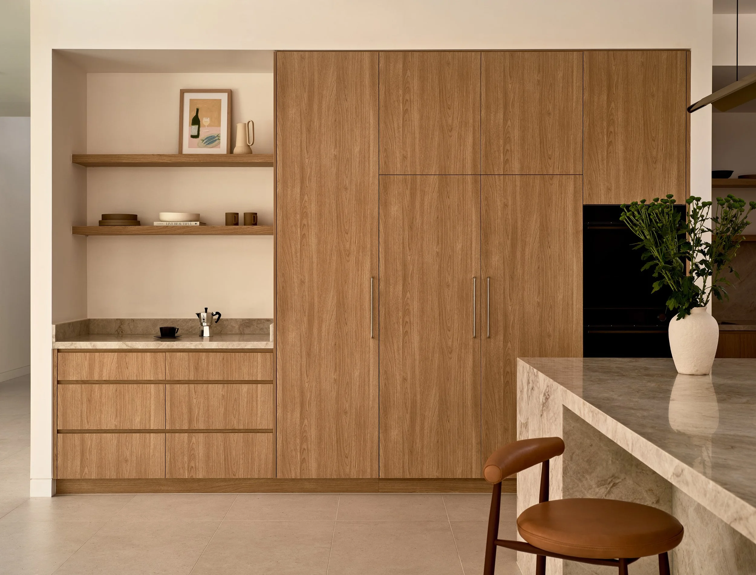 Designed for a young and growing family, this home is a refined expression of sophisticated textures, layered warmth and quiet luxury, crafted to feel like a private resort every single day. We leaned into a warm, grounded palette of soft neutrals, creamy Taj Mahal stone and natural oak to create calm, cohesive spaces that feel both elevated and effortlessly livable. The sculptural stone island anchors the kitchen as a central gathering point for entertaining, while the fireplace grounds the living area as a warm retreat for rest and relaxation. Expansive glazing frames the living room and pool, welcoming natural light to wash gently across the surfaces, softening every edge. The considered interplay of bespoke joinery detailing and tactile materials throughout shapes a beautiful home, thoughtfully aligned to the rhythm of modern family living.
