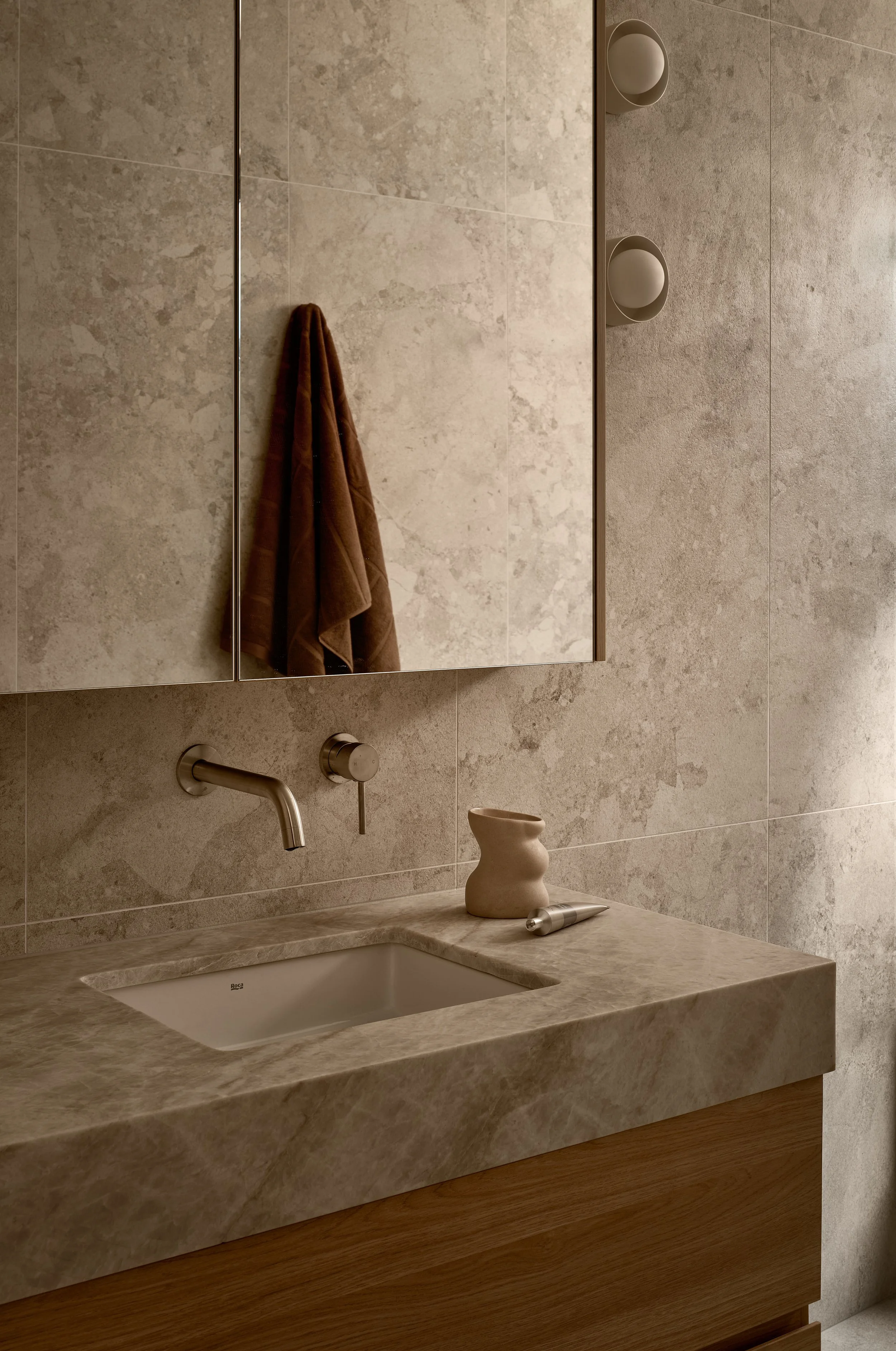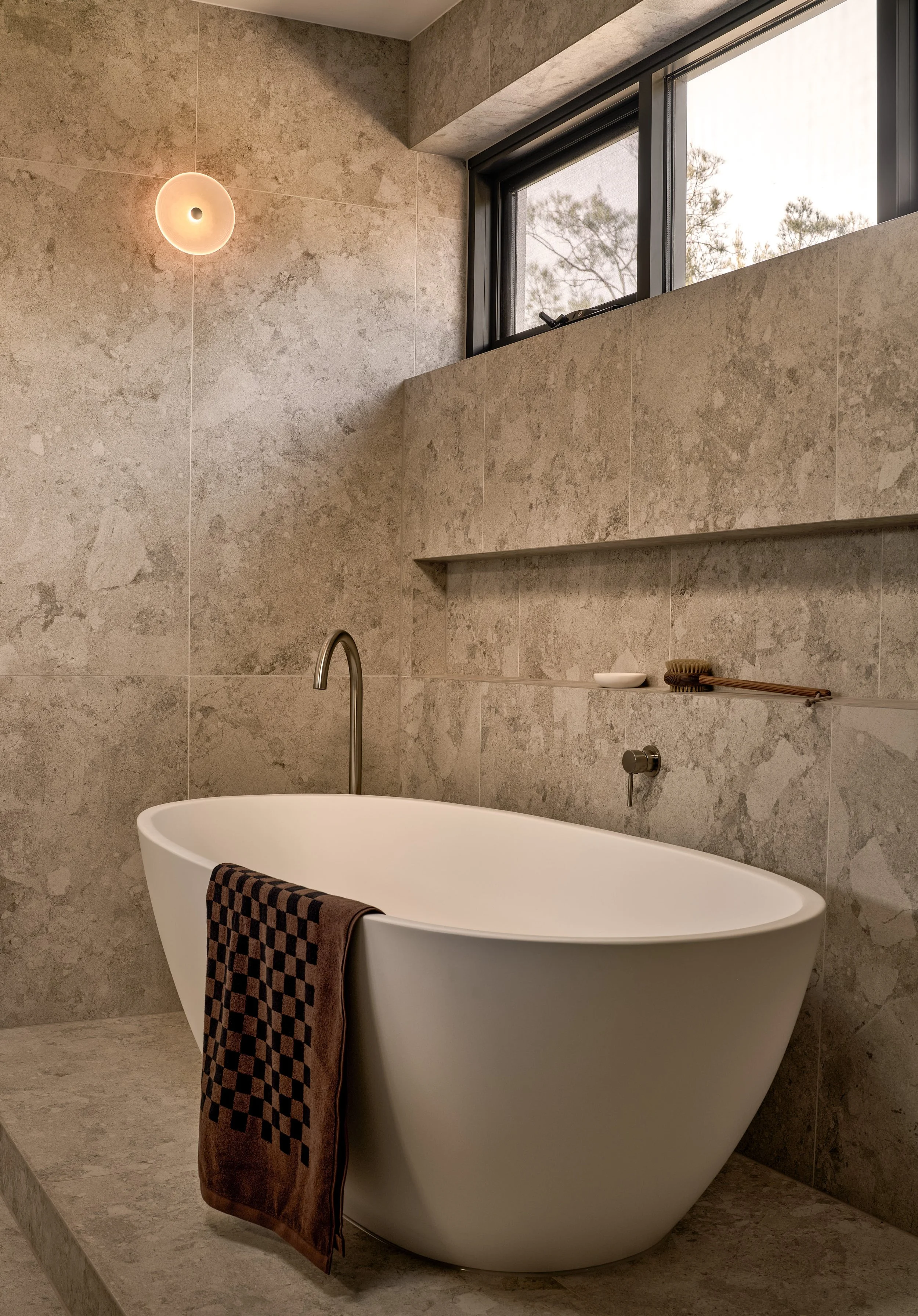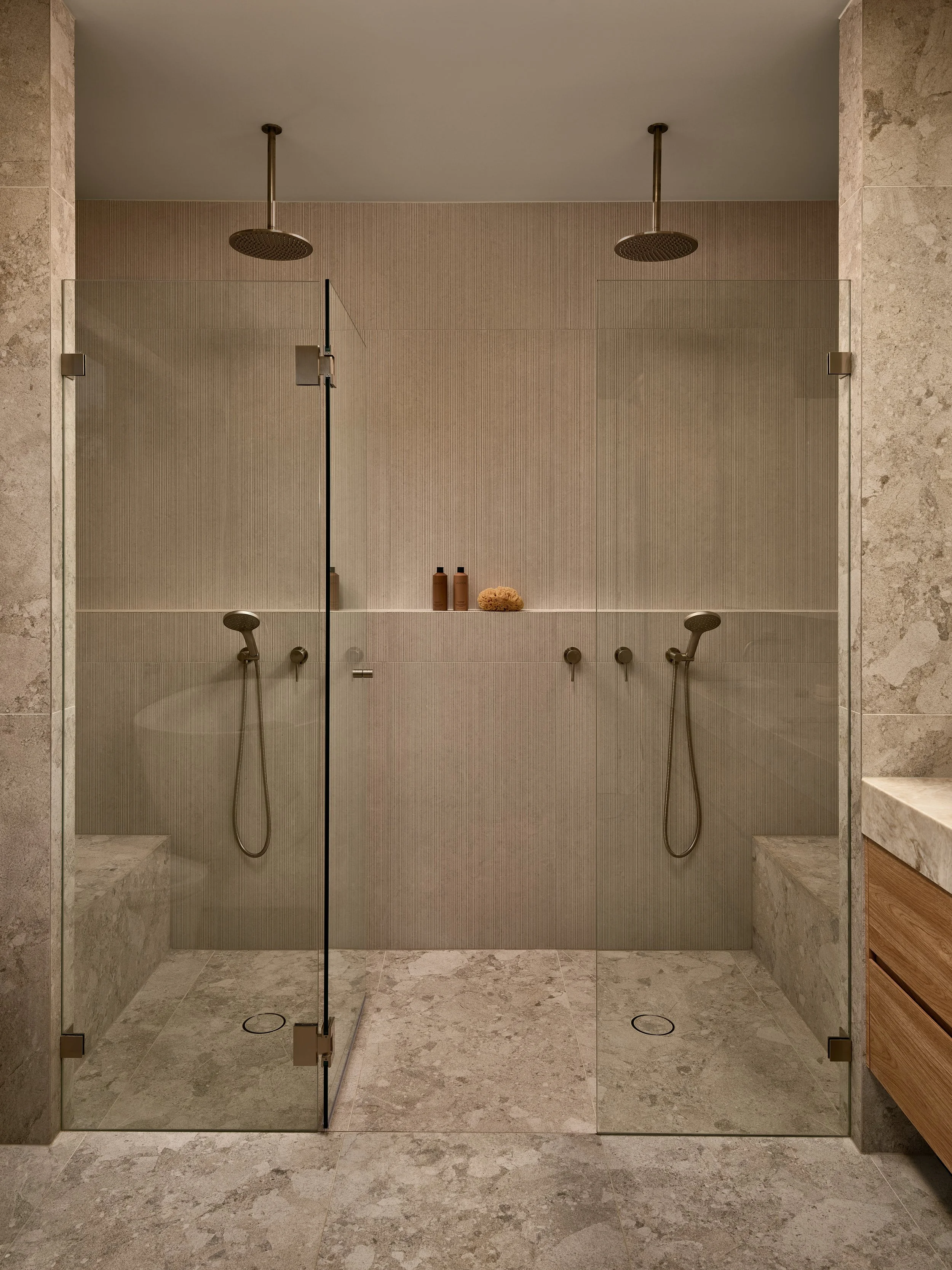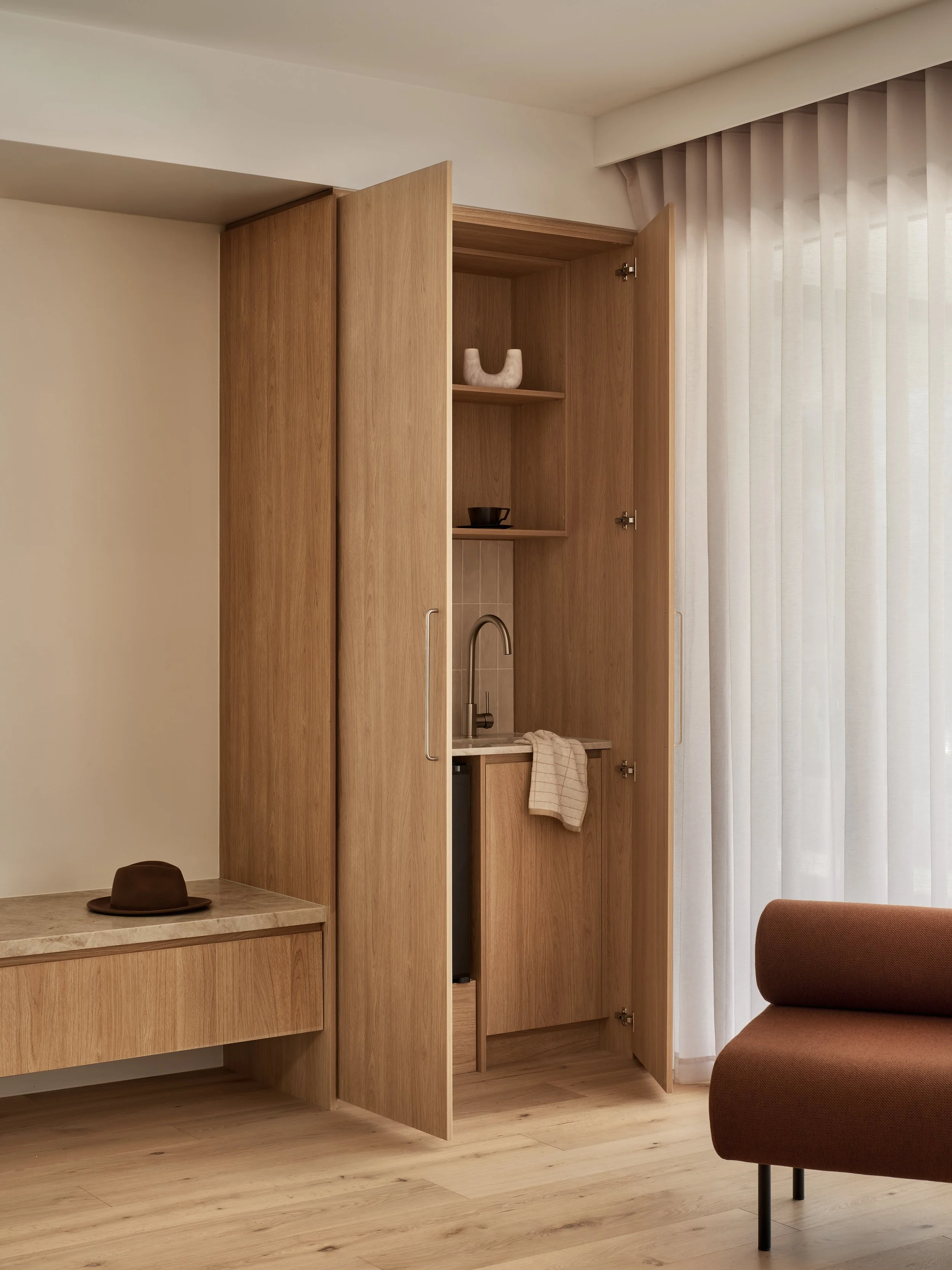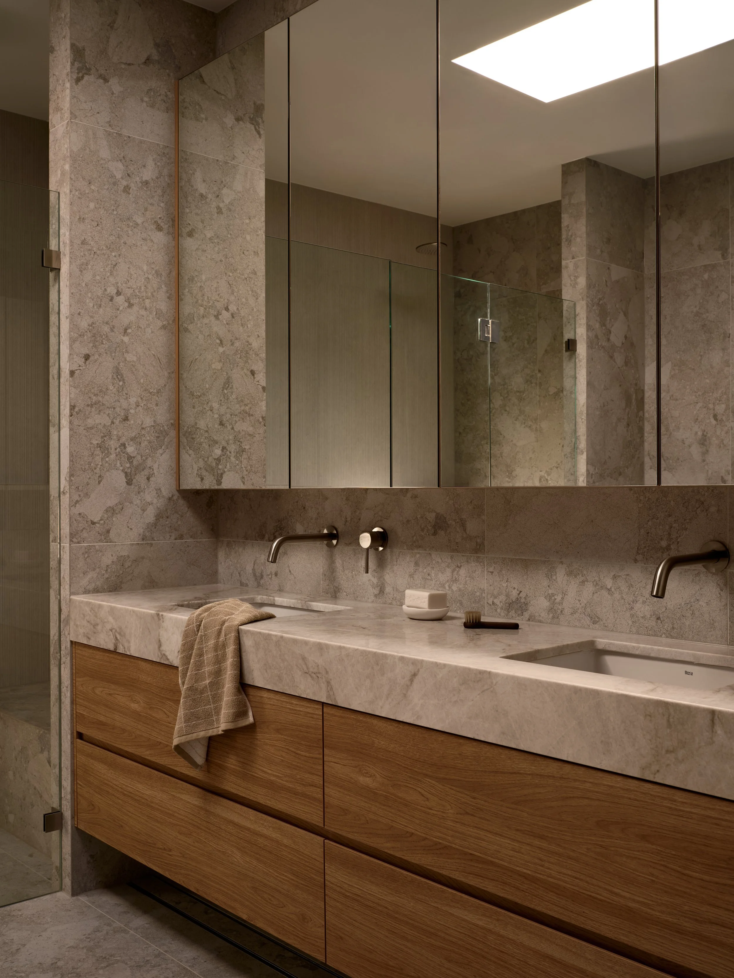 Designed for a young and growing family, this home is a refined expression of sophisticated textures, layered warmth and quiet luxury, crafted to feel like a private resort every single day. We leaned into a warm, grounded palette of soft neutrals, creamy Taj Mahal stone and natural oak to create calm, cohesive spaces that feel both elevated and effortlessly livable. The sculptural stone island anchors the kitchen as a central gathering point for entertaining, while the fireplace grounds the living area as a warm retreat for rest and relaxation. Expansive glazing frames the living room and pool, welcoming natural light to wash gently across the surfaces, softening every edge. The considered interplay of bespoke joinery detailing and tactile materials throughout shapes a beautiful home, thoughtfully aligned to the rhythm of modern family living.